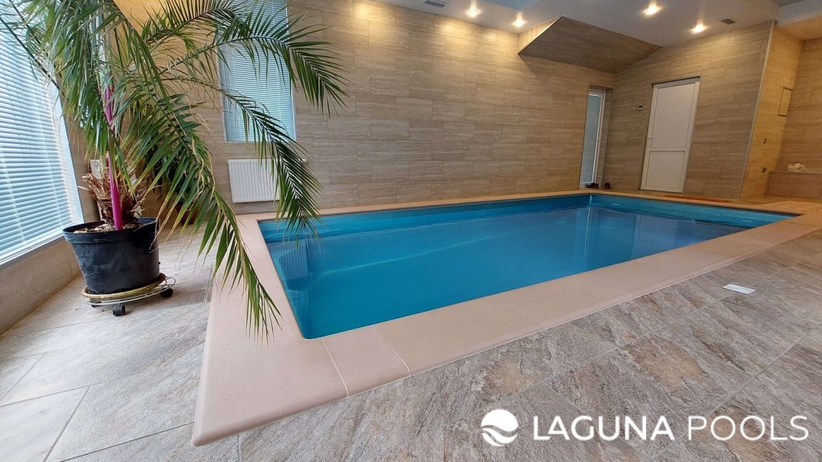 Прямоугольный композитный бассейн в помещении с плиткой