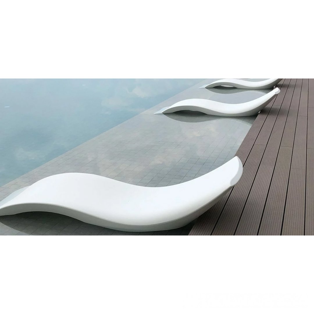 Белые волнообразные шезлонги у бассейна на тёмной композитной террасе.